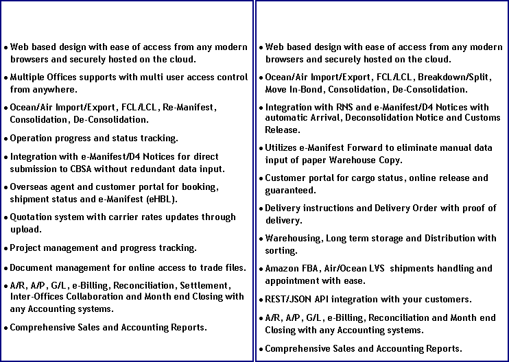 We are software developer specialized in logistics software for the supply chain industry and are one of the accredited service providers of CBSA for ACI e-Manifest House Bills (eHBL) and Release Notification System (RNS).